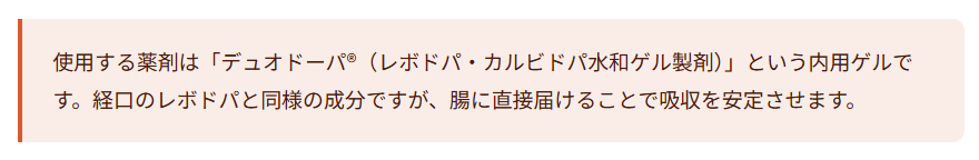 使用する薬剤は「デュオドーパ®(レボドパ・カルビドパ水和ゲル製剤)」という内用ゲルです。経口のレボドパと同様の成分ですが、腸に直接届けることで吸収を安定させます。